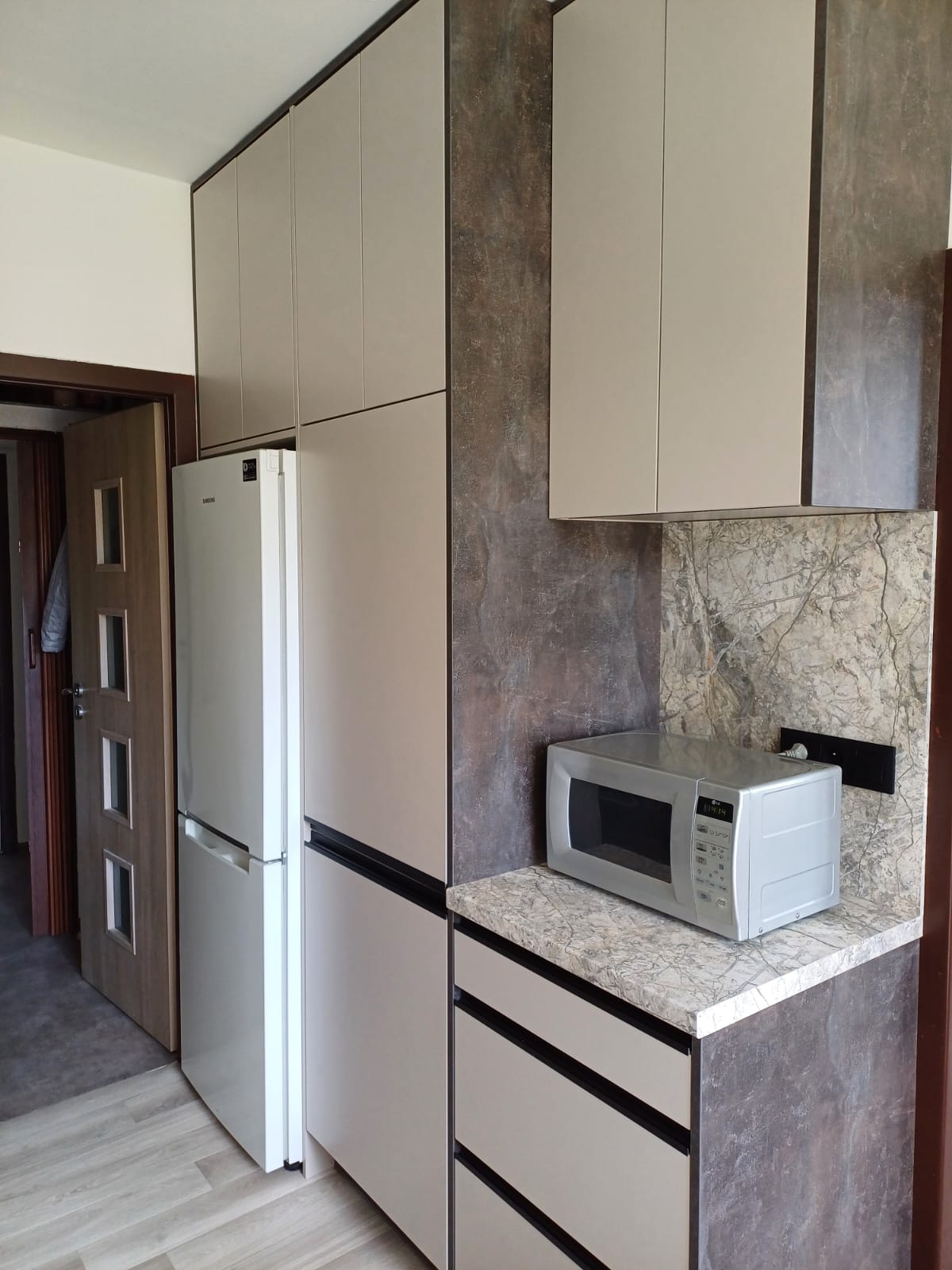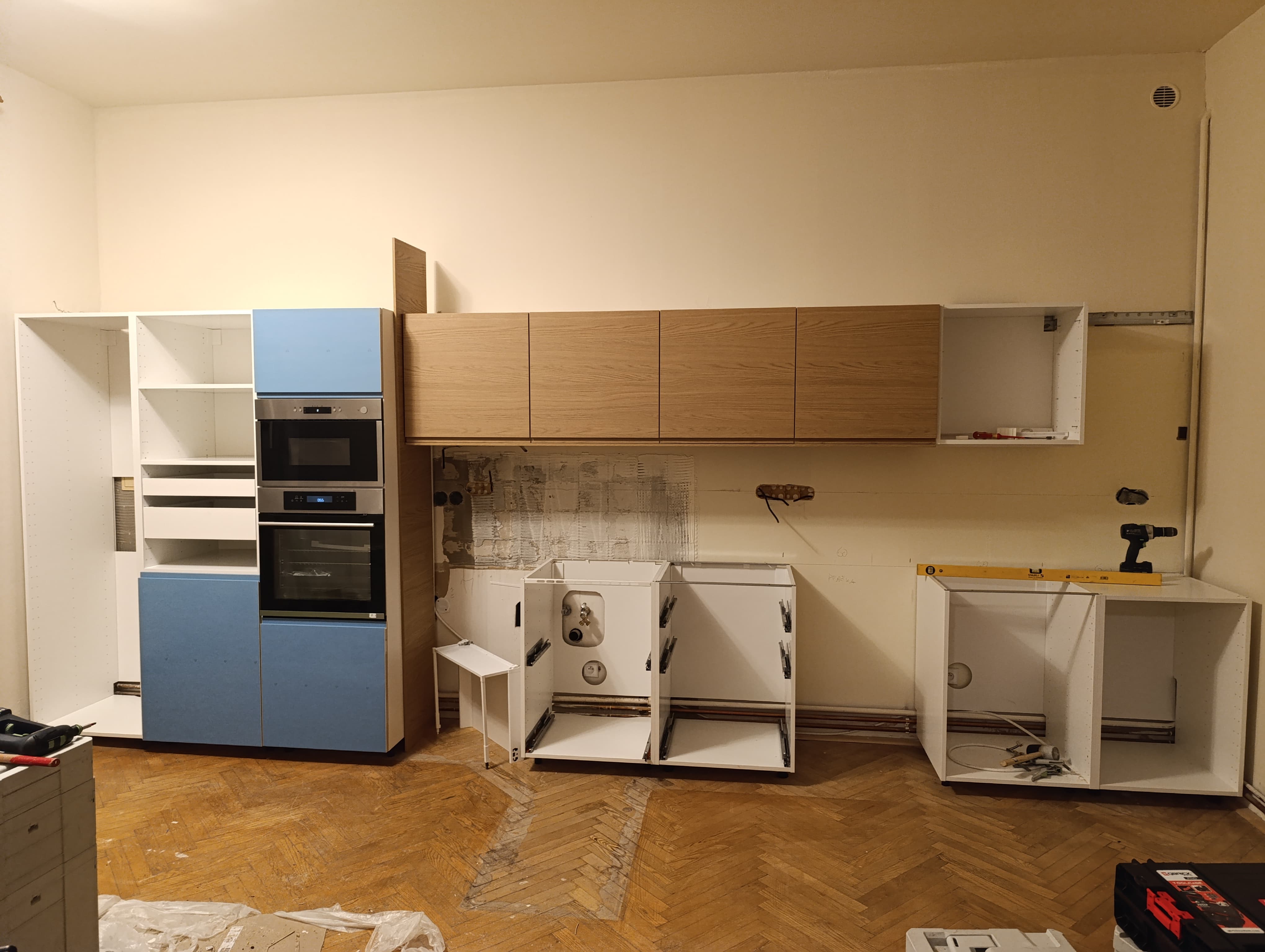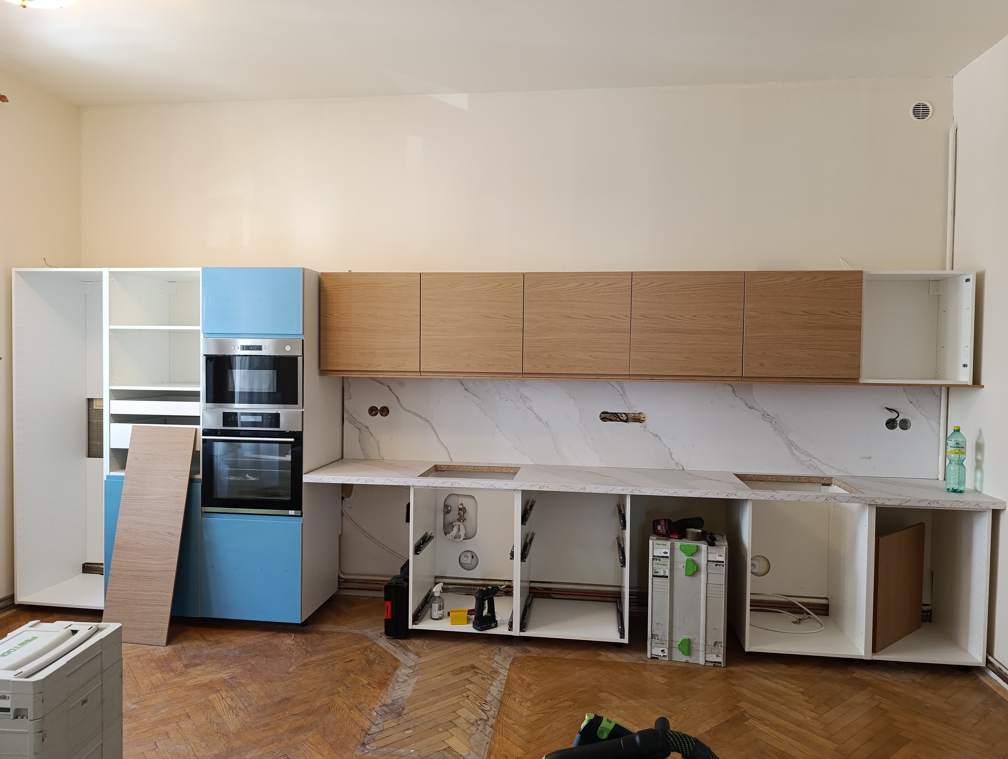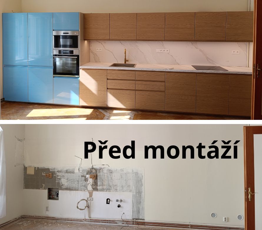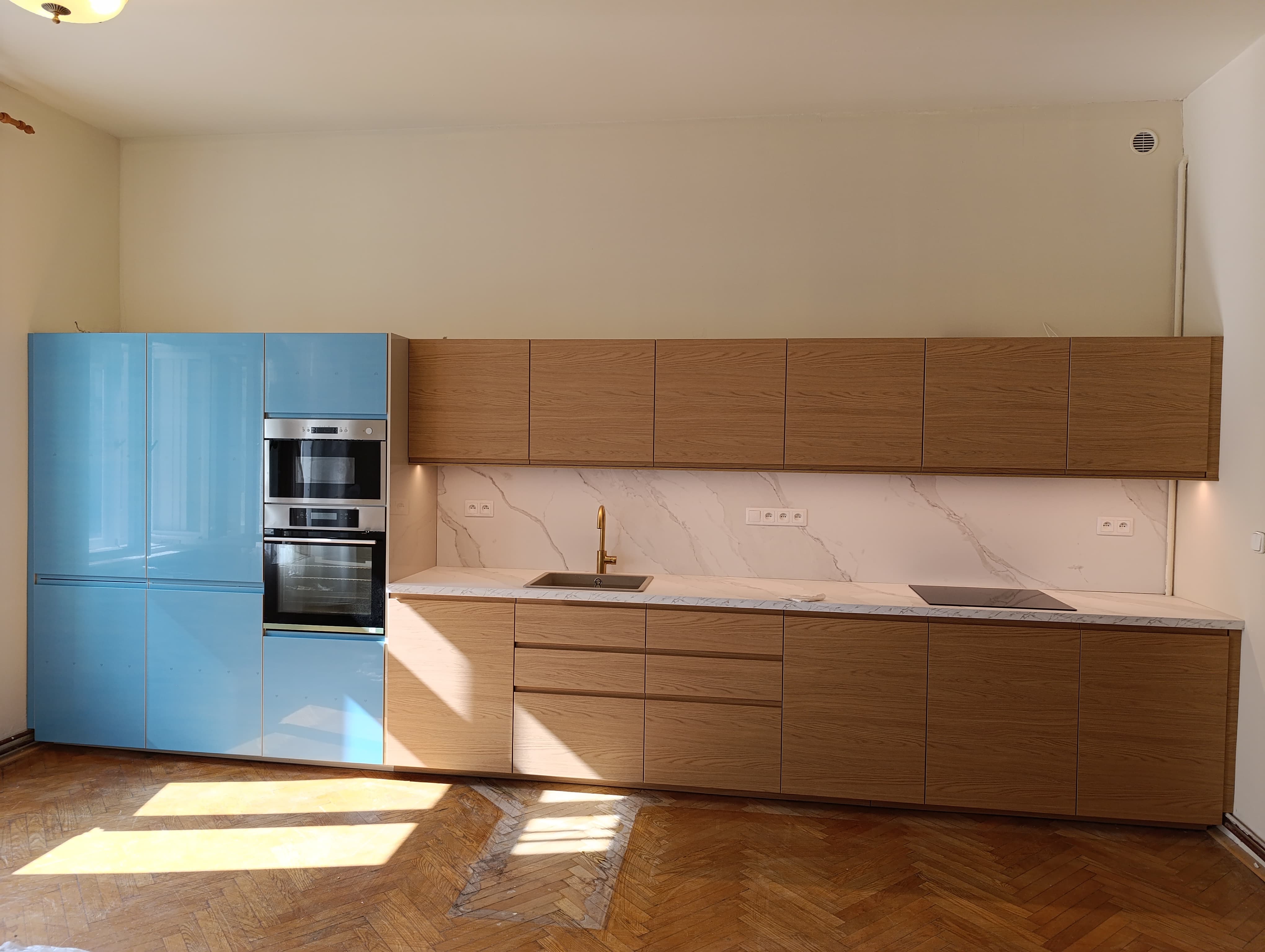 Zde se snoubí individualita s elegancí a praktičností. Tato kuchyně je zcela přizpůsobena přáním našeho klienta, který si přál modrou barvu dvířek pro svůj jedinečný prostor.Modré dvířka dodávají kuchyni živý a svěží vzhled, zatímco lesklý korpus zajišťuje moderní a elegantní povrch, který odráží světlo a opticky zvětšuje prostor.Ostrůvek představuje centrální bod této kuchyně, poskytující nejen dostatek pracovní plochy, ale také místo pro pohodlné vaření a společné setkání s rodinou a přáteli.Montáž této kuchyně zahrnuje nejen samotnou instalaci, ale také připojení vody a elektřiny, což zajišťuje bezproblémový a pohodlný proces od počátku až do konce.Kuchyně v Libni je skvělým příkladem toho, jak může být každý kuchyňský prostor individuálně přizpůsoben podle potřeb a přání klienta, aniž by byla ztracena estetika a funkčnost.