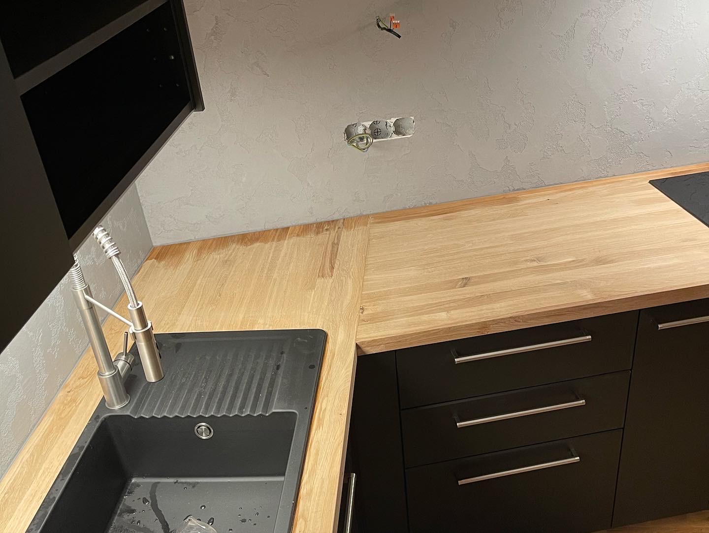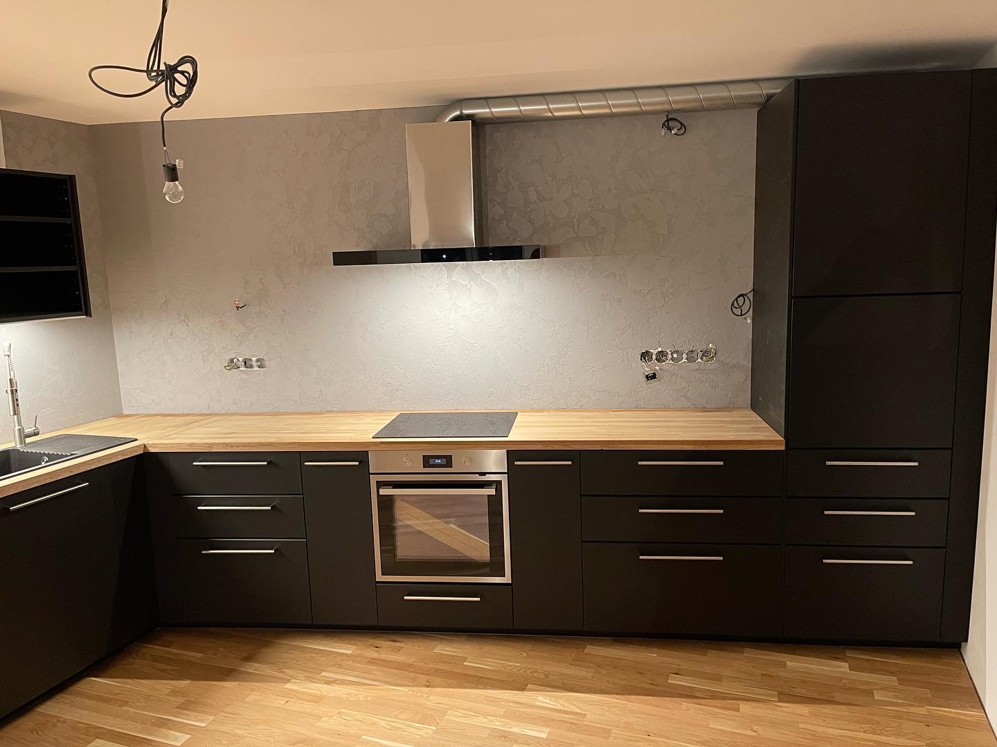 Tato kuchyně spojuje sílu a eleganci, přinášející do vašeho domova dávku charakteru a moderního stylu.Klient si zvolil masivní dubovou desku, která přináší do prostoru příjemnou tepelnou a přírodní atmosféru. Černá matná barva kuchyně dodává prostoru sofistikovaný a industriální vzhled, který zaujme svou originalitou a odvahou.Nerezové spotřebiče dokreslují moderní a funkční design této kuchyně, přičemž jejich lesk a odolnost zajišťují dlouhodobou spolehlivost a kvalitu.Realizace této kuchyně v popředí Benátského štuku dodává prostoru šarm a eleganci, které propůjčují celému interiéru jedinečný a exkluzivní ráz.Industriální kuchyně s provedením černá matná je ideální volbou pro ty, kteří hledají kuchyni s výrazným osobitým stylem, která se zároveň pyšní prvotřídní kvalitou a funkčností.
